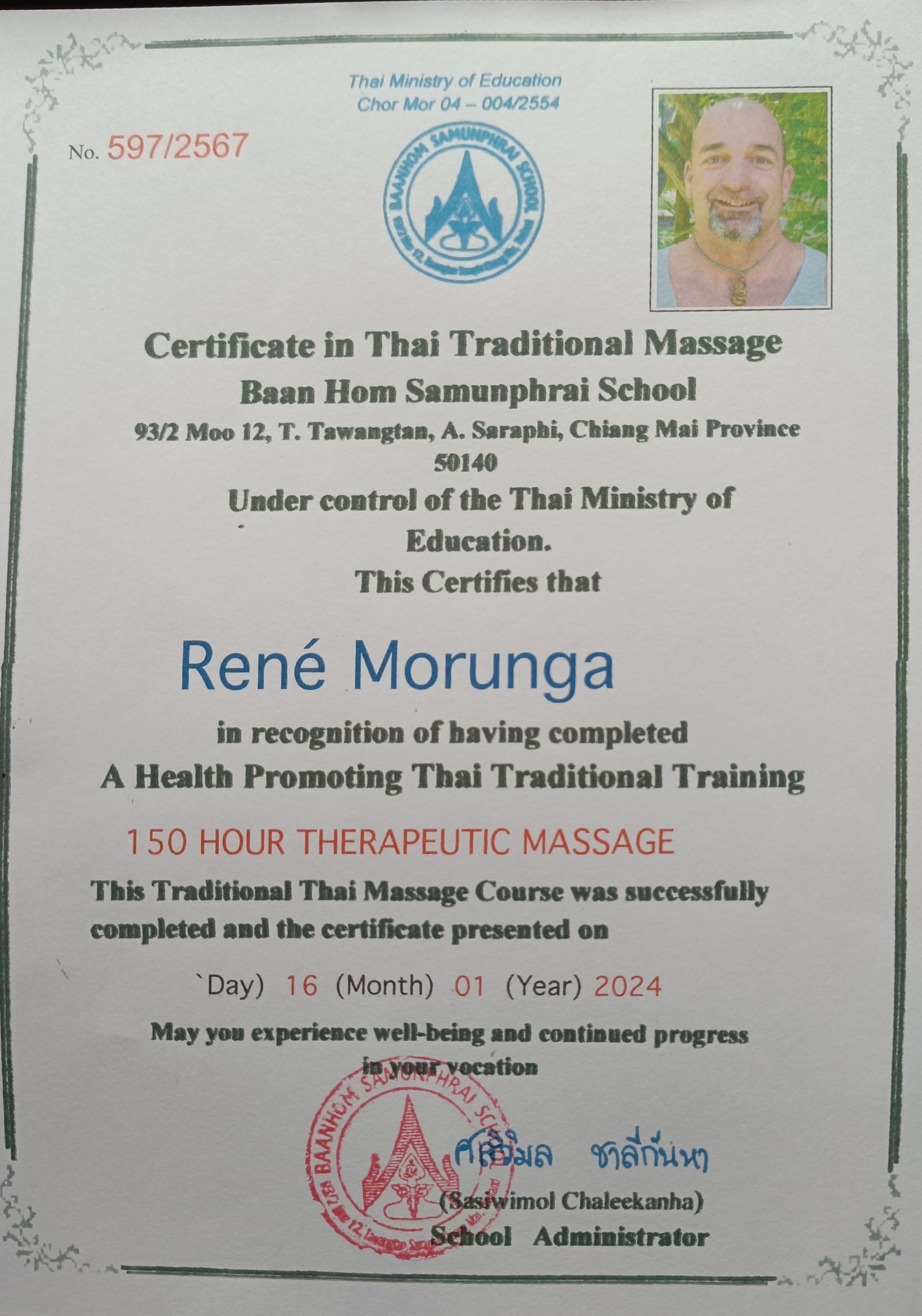 Kenntnisse aus, indem ich weitere Schulen in Thailand besuchte. Nun folgte der letzte Schritt, nach 21 Jahren als Masseur erlernte ich die hohe Kunst der gezielten Behandlung von Problemen in Form der Medical Thaimassage in Chiang Mai/Nordthailand zum Wohle meiner Klienten.